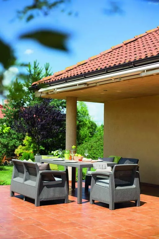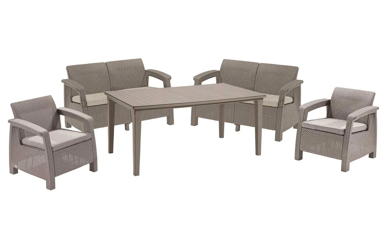 A Corfu Fiesta bútor szett felülete rattant imitáló anyagból készült. A szett két fotelt, két darab kétszemélyes kanapét és egy nagy négyszögletes asztalt tartalmaz, ennek köszönhetően kiválóan alkalmas étkezésekhez is. Tökéletes nagy terek berendezésére, kiváló családi grill- vagy kerti partik rendezéséhez. A bútorok tartósak és ellenállnak az időjárás viszontagságainak, valamint az UV sugárzásnak. A Corfu Fiesta elegáns színárnyalatokban kapható. Összeszerelése könnyű, tisztítása egyszerű.