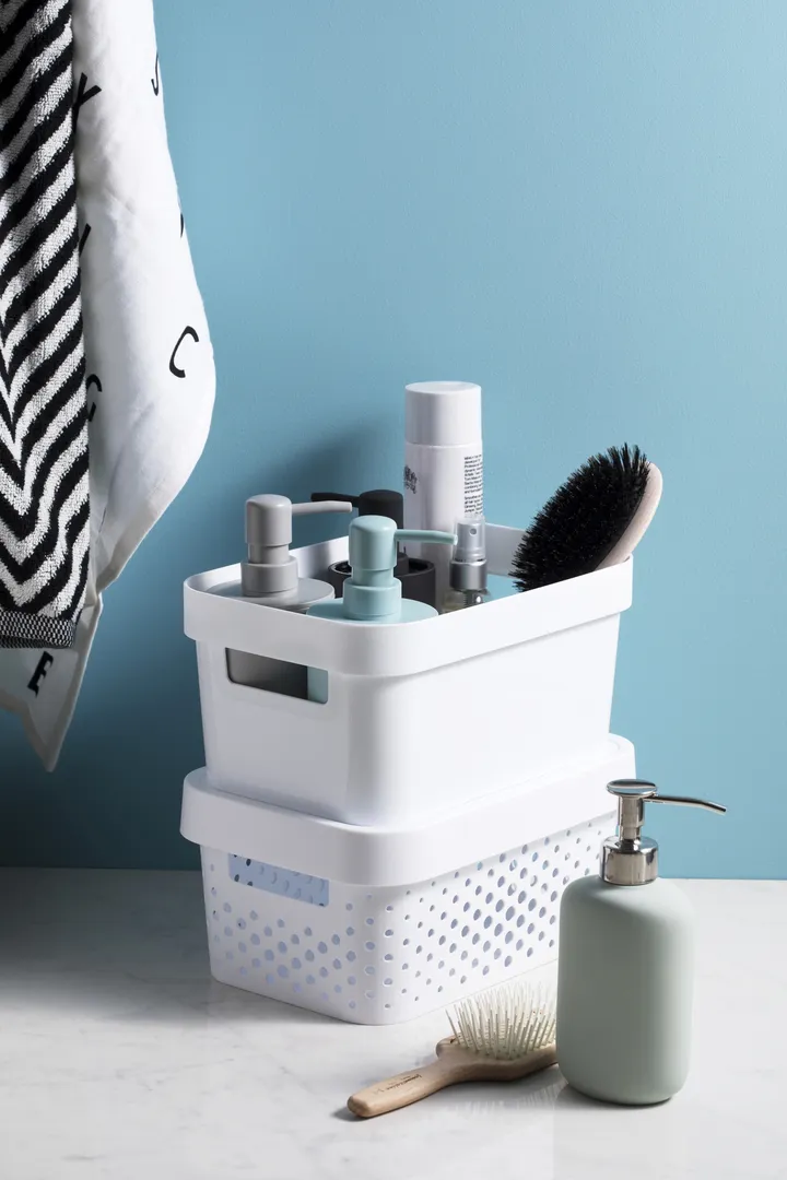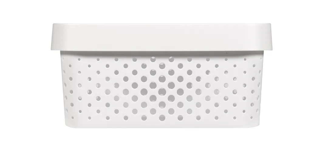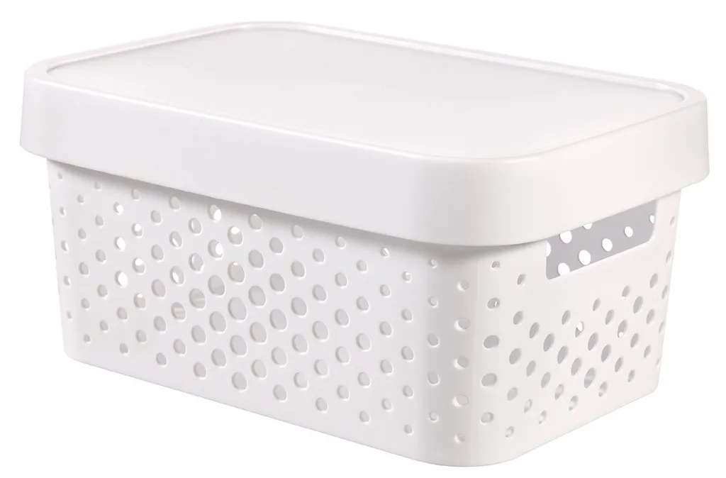 Az Infinity tárolódoboz egy moduláris és multifunkcionális tárolási megoldás az otthonodba. Ideális sok tárgy rendezett tárolására, melyek a doboz tetejének köszönhetően midig tiszták maradnak. Kényelmes fogantyúinak köszönhetően könnyedén szállítható, így az ékszerek, konyhai és fürdőszobai kiegészítők, vagy a különböző papírok bármely szobában helyet kaphatnak. A legjobb minőségű műanyagból készül, így ellenálló és könnyen tisztítható. Az egyedi, lyukacsos mintázat skandináv stílust kölcsönöz neki, amely tökéletes kiegészítője bármely szobának! További előnye a terméknek, hogy 100%-ban újrahasznosított anyagból készül, így rendkívül környezettudatos.