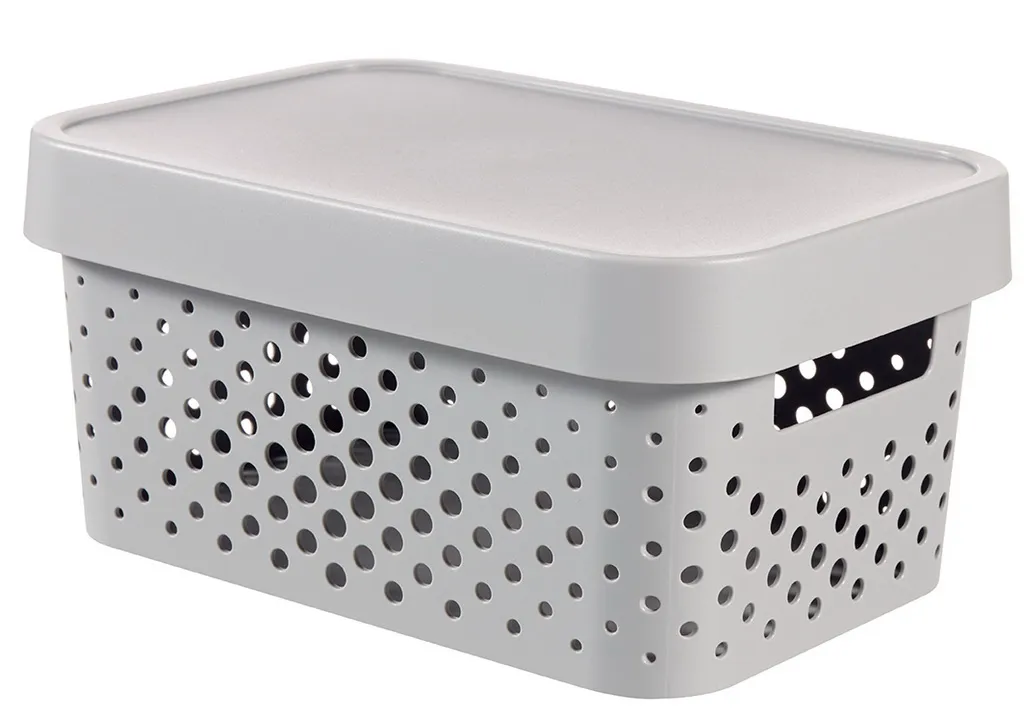 Az Infinity tárolódoboz egy moduláris és multifunkcionális tárolási megoldás az otthonodba. Ideális sok tárgy rendezett tárolására, melyek a doboz tetejének köszönhetően midig tiszták maradnak. Kényelmes fogantyúinak köszönhetően könnyedén szállítható, így az ékszerek, konyhai és fürdőszobai kiegészítők, vagy a különböző papírok bármely szobában helyet kaphatnak. A legjobb minőségű műanyagból készül, így ellenálló és könnyen tisztítható. Az egyedi, lyukacsos mintázat skandináv stílust kölcsönöz neki, amely tökéletes kiegészítője bármely szobának! További előnye a terméknek, hogy 100%-ban újrahasznosított anyagból készül, így rendkívül környezettudatos.