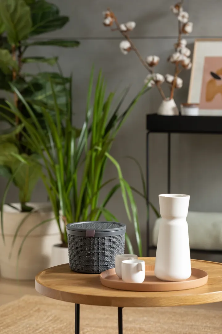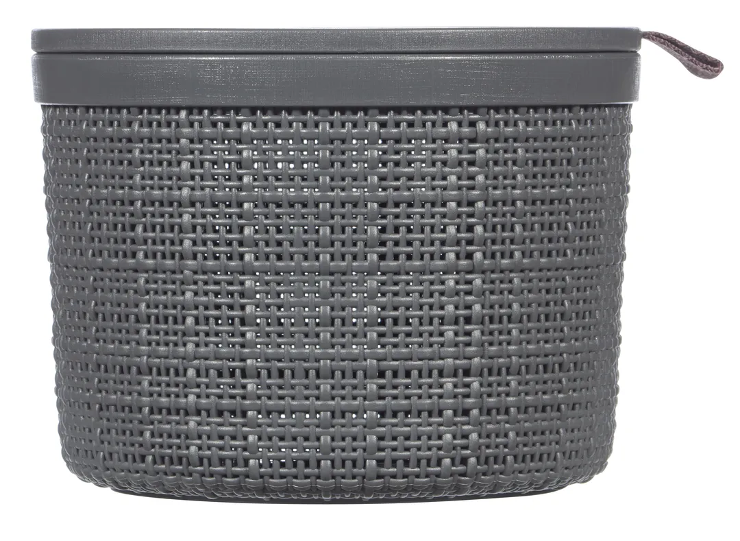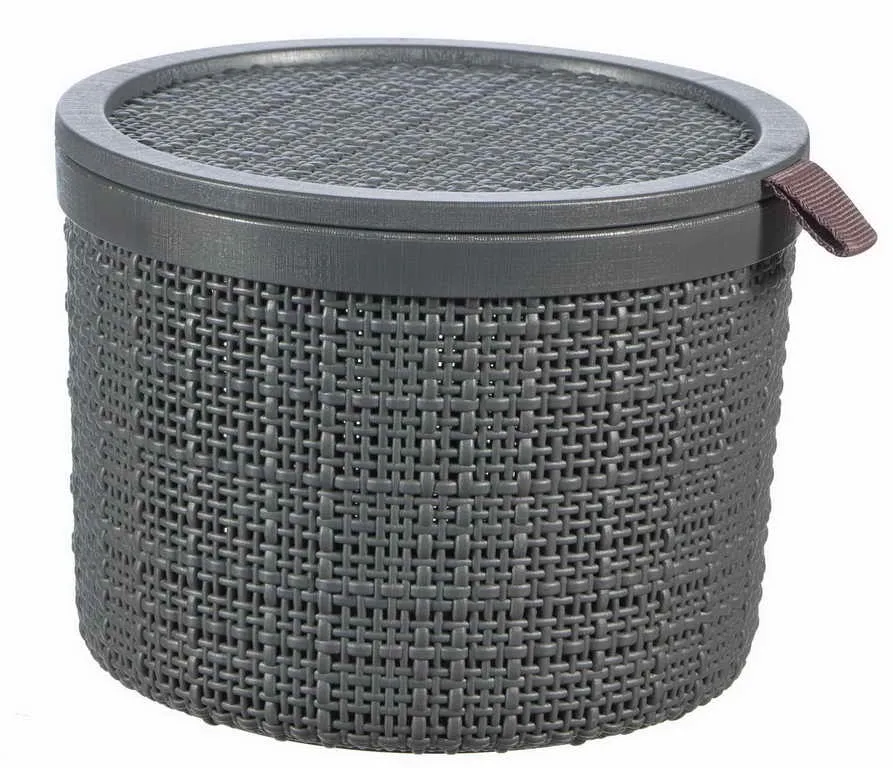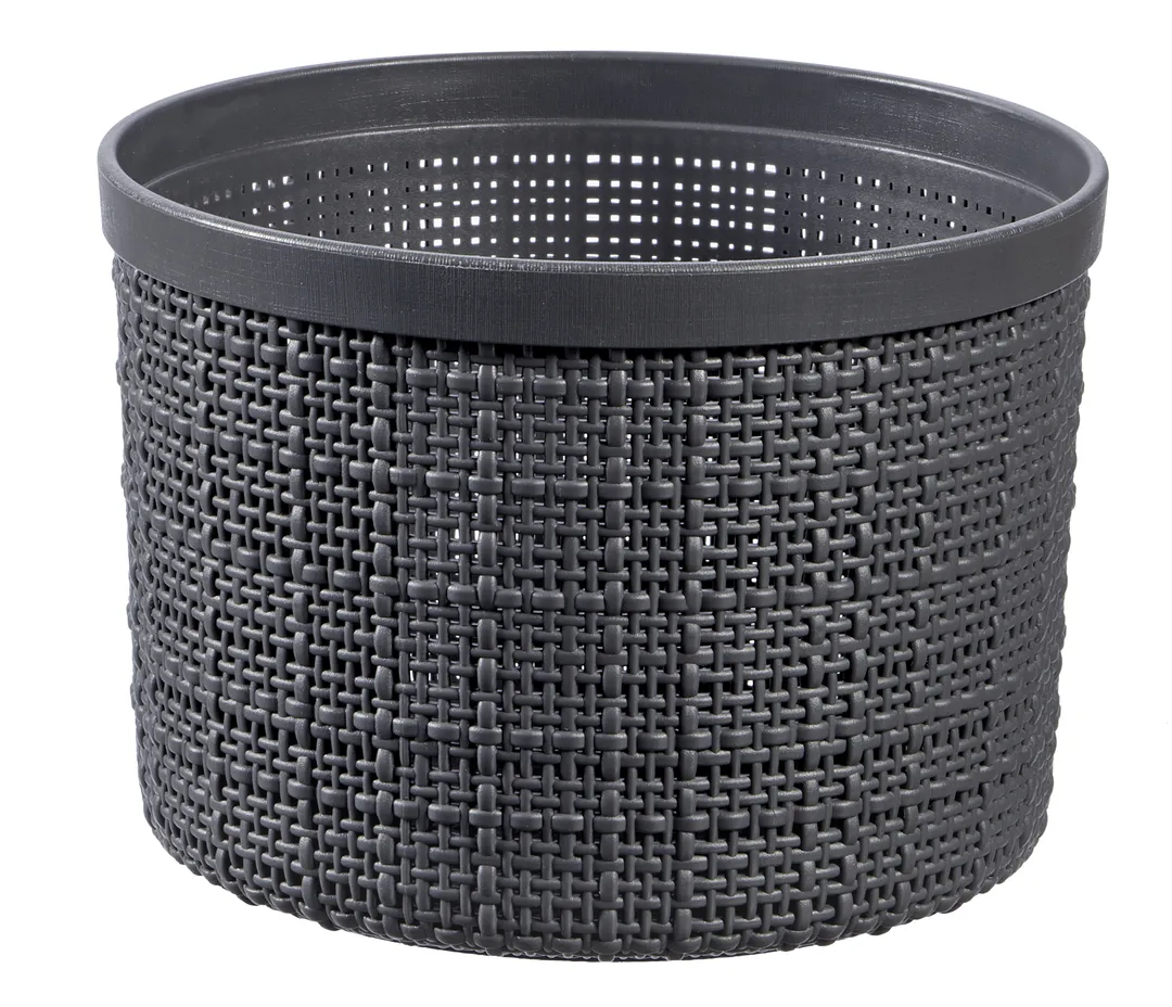 A Jute termékcsalád kerek, tetővel rendelkező kosara tökéletes választás mindenki számára, aki praktikus és stílusos otthoni rendszerezőt keres. Ez az esztétikus termék tökéletes alternatívát jelent a kozmetikumok tárolására a fürdőszobában, a konyhai kiegészítőknek, vagy akár a nappali dekorációinak. Az egyedi és különleges textúrája szőtt mintázatot imitál, ezzel kölcsönözve modern és elegáns megjelenést a kosárnak. Ennek köszönhetően a termék bármilyen stílusú belső térhez jó választás. Praktikus fogantyúinak köszönhetően rendkívül egyszerűen mozgatható, valamint a polcról is könnyedén levehető. Ha a kosarak éppen nincsenek használatban, akkor kialakításuknak köszönhetően tökéletesen egymásba tehetők, ezzel sok értékes helyet megtakarítva. A Jute kosarak 100%-ban újrahasznosított műanyagból készülnek, így teljes mértékben környezetbarátak. Anyaga könnyen tisztítható és rendkívül tartós, így éveken át jó szolgálatot fog tenni.