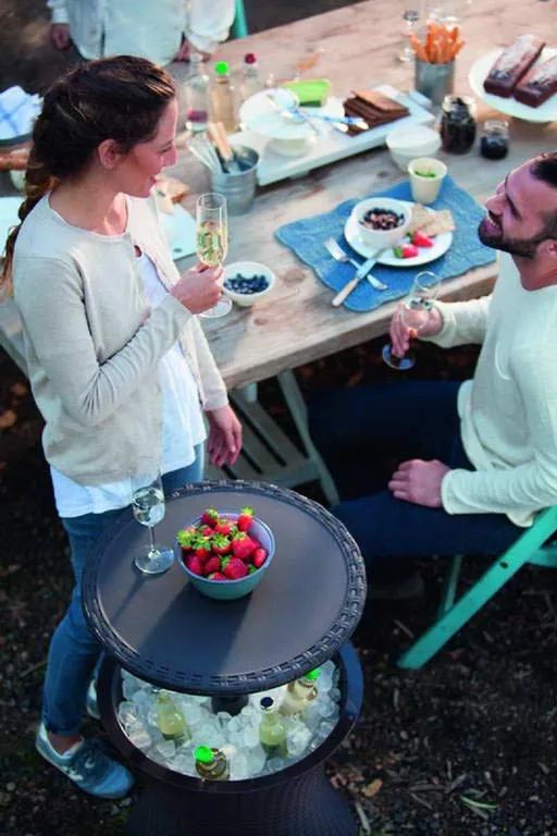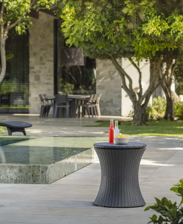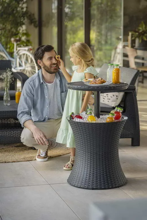 Funkcionális kerti italtartó asztal. Összecsukva kézreálló dohányzóasztal, szétnyitva klasszikus bárasztal italhűtő tárolóval. Az elegáns dizájn, a fonott rattant imitáló kivitelezés és a funkcionalitás azt eredményezi, hogy a Rattan Cool Bar nagy segítségünkre válik a kerti baráti vagy családi összejövetelek során.