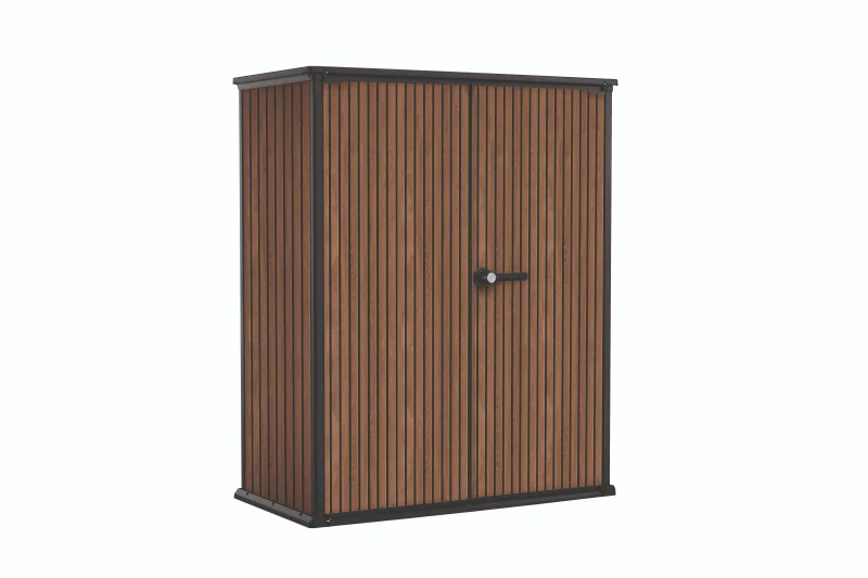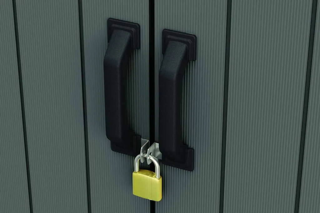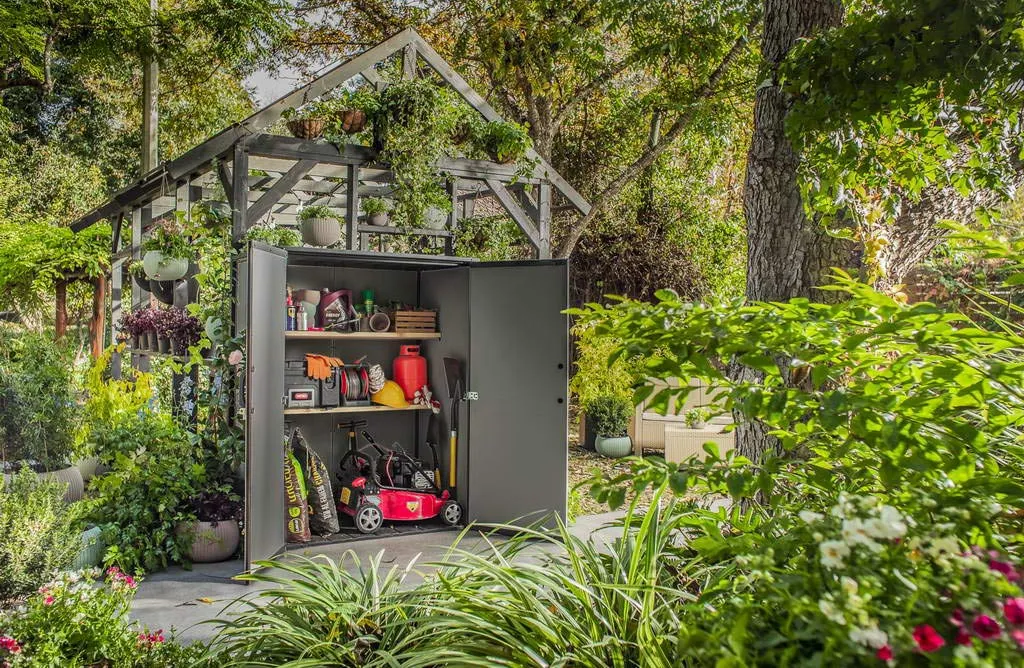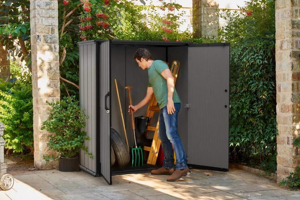 A Premier Tall szerszámos szekrény tökéletes a hosszú kerti szerszámok és más tárgyak részére, melyek méretüknél fogva nem tárolhatók máshol. Az 1500 L űrtartalmú szekrény döntött küszöbének köszönhetően ideális nehéz tárgyak tárolására is, melyeket így könnyebben be lehet tolni vagy ki lehet húzni. A beépített padlólap megvédi a tárgyakat az esővíztől és a sártól, a zárral ellátott ajtó pedig megelőzi a lopás lehetőségét éjjel és nappal. A megerősített bordázatú falak ellenállnak az időjárási körülményeknek, ezért a tároló nem igényel karbantartást.
