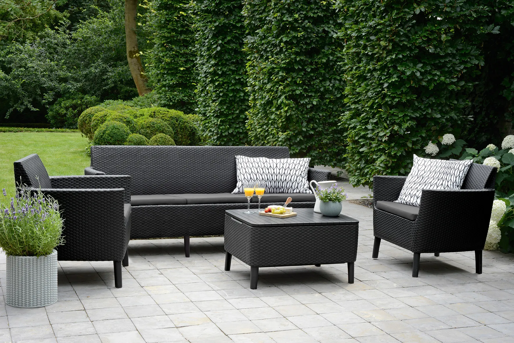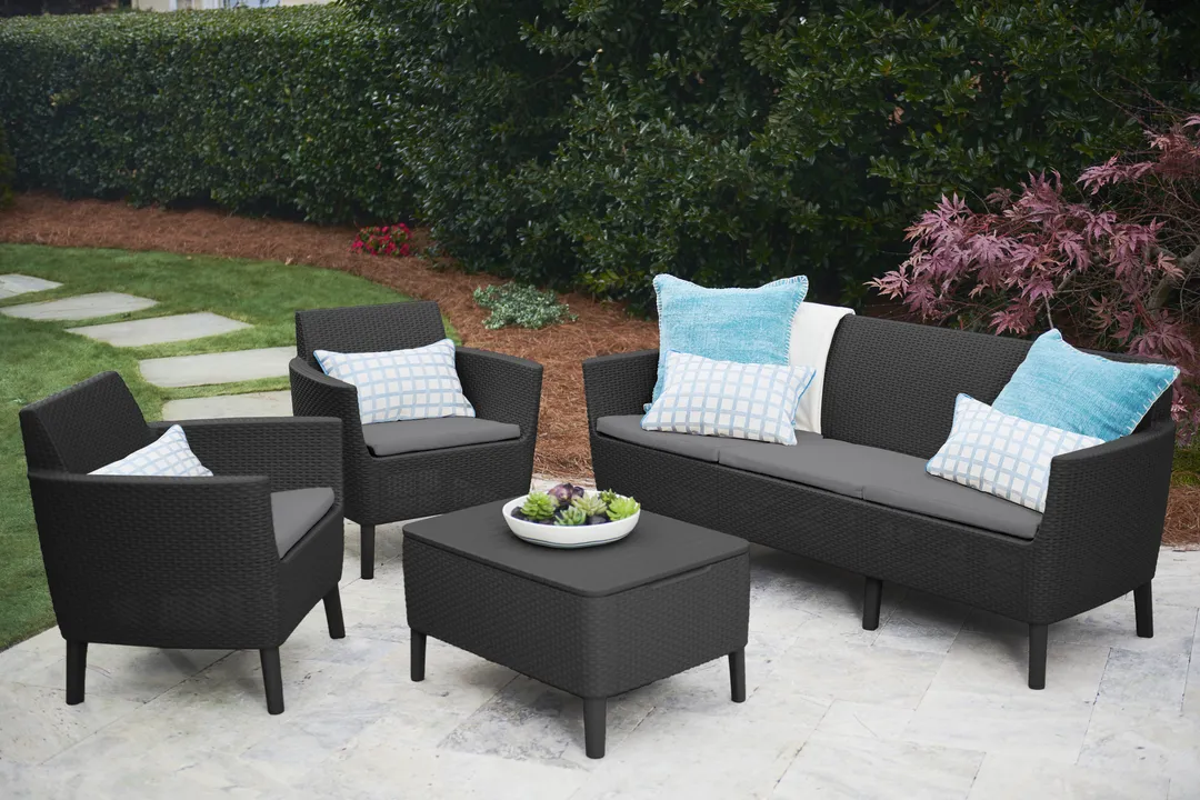Modern dizájn, elegancia és a kényelmes használat az 5 személyes Salemo kerti bútor szett fő előnyei. A garnitúra egy széles, kényelmes háromszemélyes kanapét, 2 fotelt és egy tároló funkcióval rendelkező kis asztalt tartalmaz. A bútorokra jellemző az egyedi, természetes rattan fonás inspirálta felület, amely rendkívül esztétikus külsőt kölcsönöz nekik. A bútor szett tökéletesen beleillik a kertekbe, teraszokra, de akár a belterekbe is. A szett divatos színválasztékban kapható, nagyon egyszerű az összeszerelése és a karbantartása. Ellenáll a kedvezőtlen időjárási tényezők hatásának és az UV sugárzásnak is.