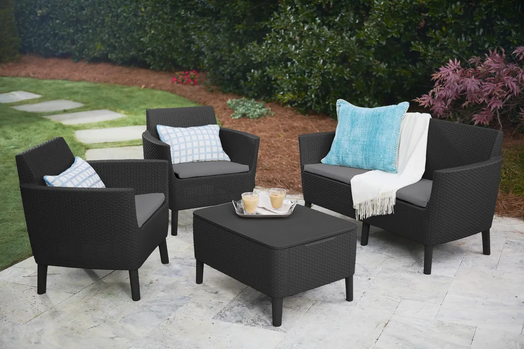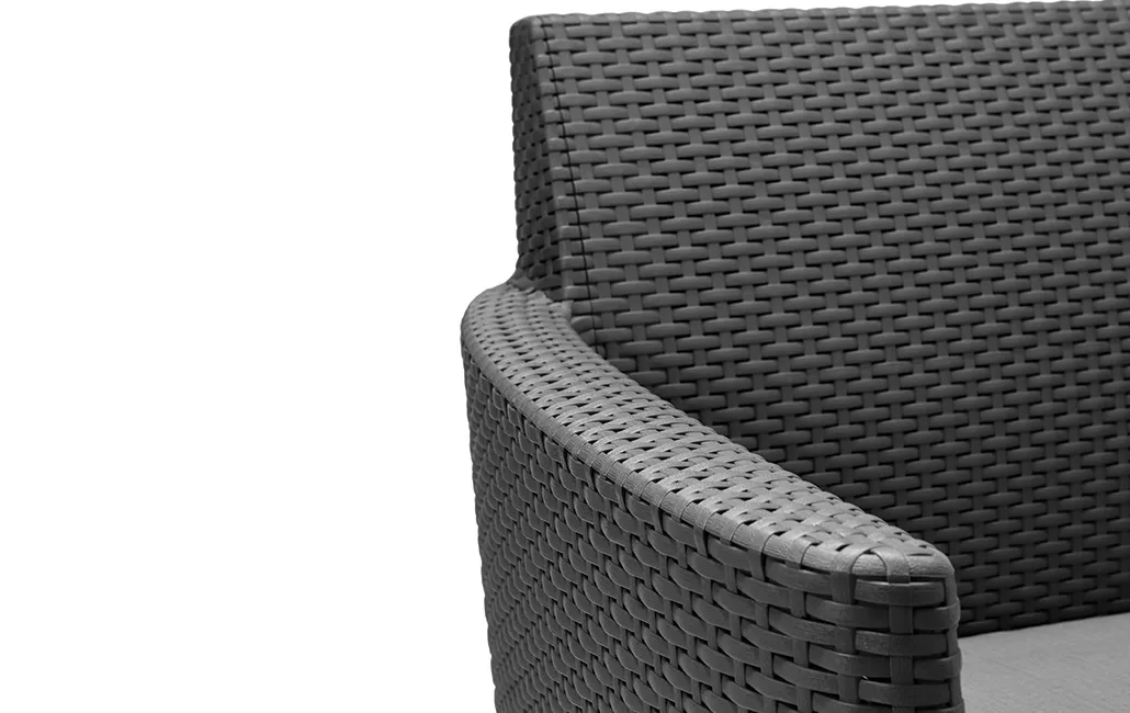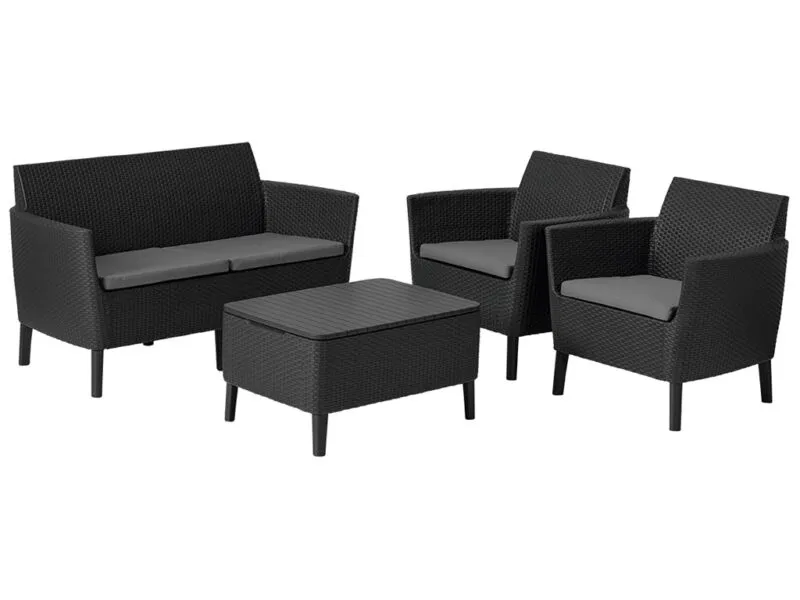 Modern dizájn, elegancia és a kényelmes használat a Salemo kerti bútor szett fő előnyei. A garnitúra egy széles, kényelmes kétszemélyes kanapét, 2 fotelt és egy tároló funkcióval rendelkező kis asztalt tartalmaz. A bútorokra jellemző az egyedi, természetes rattan fonás inspirálta felület, amely rendkívül esztétikus külsőt kölcsönöz nekik. A bútor szett tökéletesen beleillik a kertekbe, teraszokra, de akár a belterekbe is. A szett divatos színválasztékban kapható, nagyon egyszerű az összeszerelése és a karbantartása. Ellenáll a kedvezőtlen időjárási tényezők hatásának és az UV sugárzásnak is.