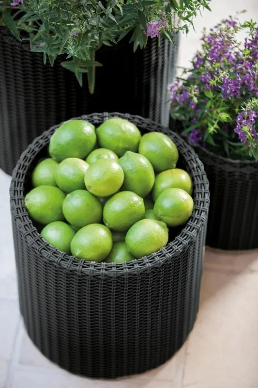 A Cylinder Planter kaspó szett egy három virágtartóból álló szett hagyományos stílusban. A természetes rattan fonást hűen imitáló felület minden kertbe passzol, kiválóan illeszkedik annak stílusához. Ideális a kúszónövényekhez de a hagyományos növény kompozíciókhoz is. A gyártáshoz használt magas minőségű műanyagoknak köszönhetően a virágtartók ellenállnak az időjárás viszontagságainak. A beépített, felesleges vizet elvezető elfolyónyílás a termék további előnyét képezi. A szett egy kicsi, egy közepes és egy nagy méretű Cylinder Planter virágtartóból áll.