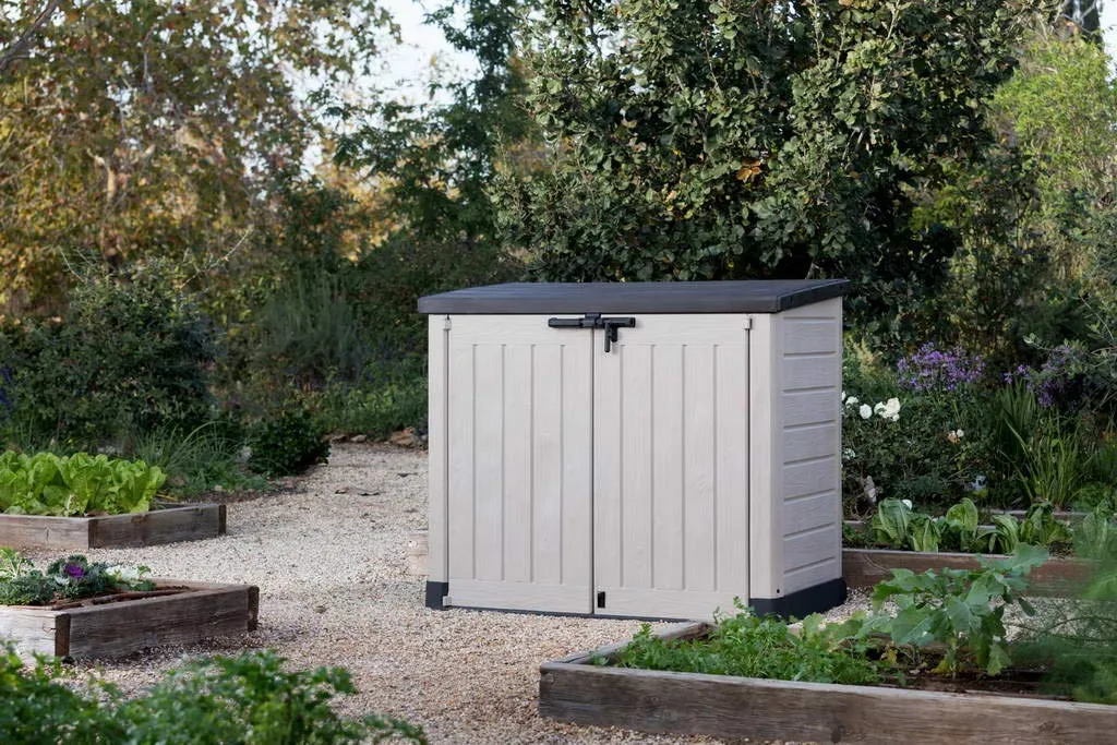 A Store It Out Max tároló egy jó megoldás, ha ötleteket keresünk a terasz, vagy a kert rendszerezésére. A tároló ideális a kerti tartozékok tárolására, legyen szó akár a grillsütőről, kerti szerszámokról, talicskákról, vagy kisebb kerti bútorokról. Magas minőségű anyagokból készült, hatékonyan megvédi a benne tárolt tárgyakat a nedvességtől és a szennyeződéstől. A nyitható fedél és a kétszárnyú ajtó megkönnyítik a használatát, erős szerkezete garantálja a termék tartósságát. A lekerekített küszöb lehetővé teszi a nagyobb tárgyak elhelyezését a tárolóban.