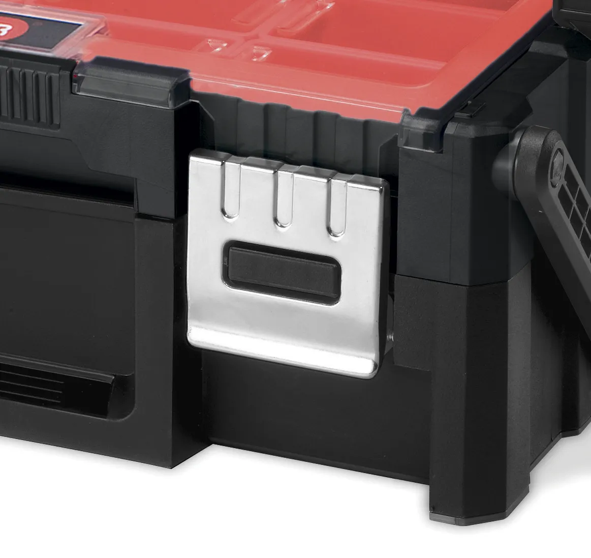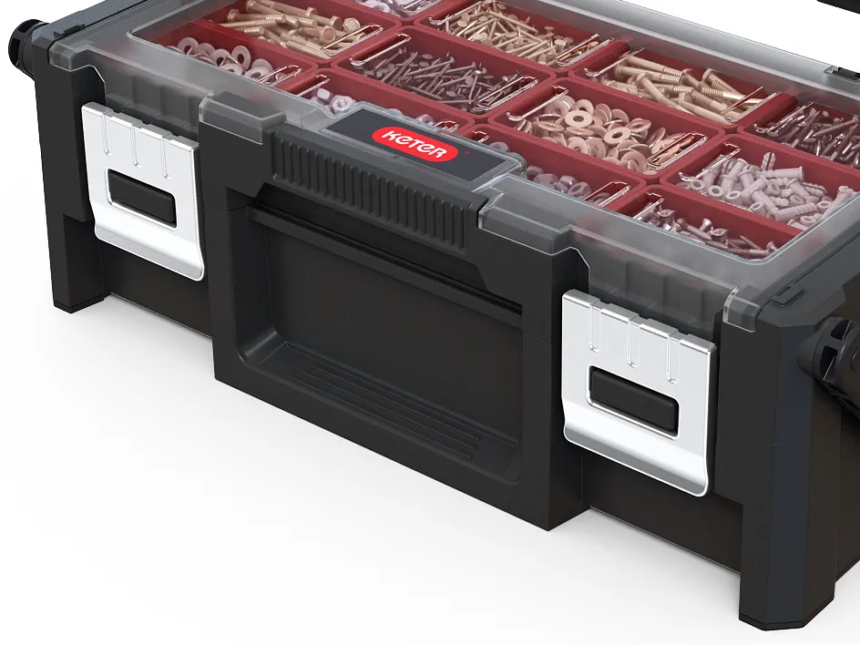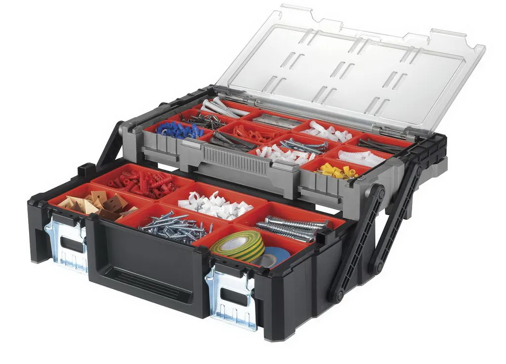 Nagy méretű rendszerező, amely segít a szerszámok és kisebb alkatrészek tárolásában. Átlátszó tetejének köszönhetően mindig látható a tartalma. 2 szintes kialakítás, felül 12 kisebb, alul pedig 6 nagyobb rekesszel, amelyek eltávolíthatók a nagyobb szerszámok tárolása érdekében.