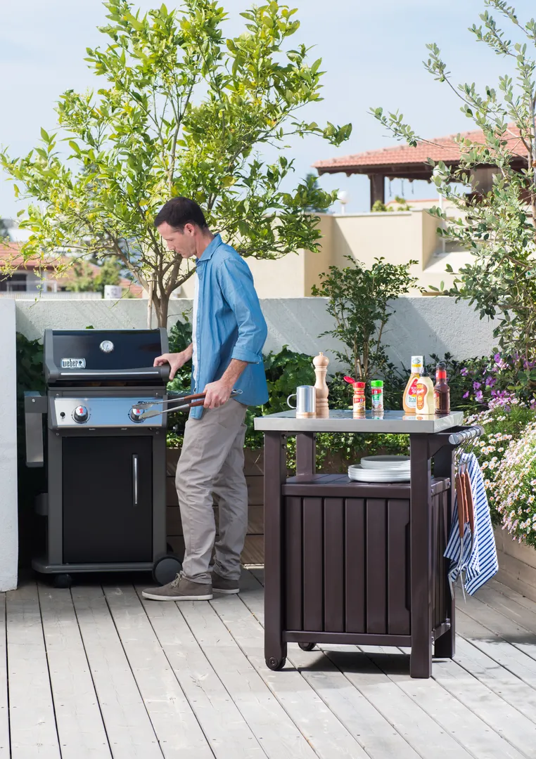 A funkcionális és ötletes megoldásokkal ellátott, stílusos Unity 93L-es grill asztal bármilyen kertbe, vagy teraszra tökéletes választás. A termék fő előnye a multifunkciós kialakítás. Az átgondolt szerkezetéből kifolyólag a termék ételek előkészítésére szolgáló asztalként, valamint különböző termékek és összetevők tárolására szolgáló szekrényként is használható. A termék rozsdamentes acélból készült asztallappal, akasztókkal felszerelt kézreálló fogantyúval és kerekekkel is rendelkezik, amely rendkívül egyszerűvé teszi a termék mozgatását. A tágas szekrényben kényelmesen elférnek az ételek tárolásához és felszolgálásához szükséges eszközök. Könnyedén összeszerelhető.