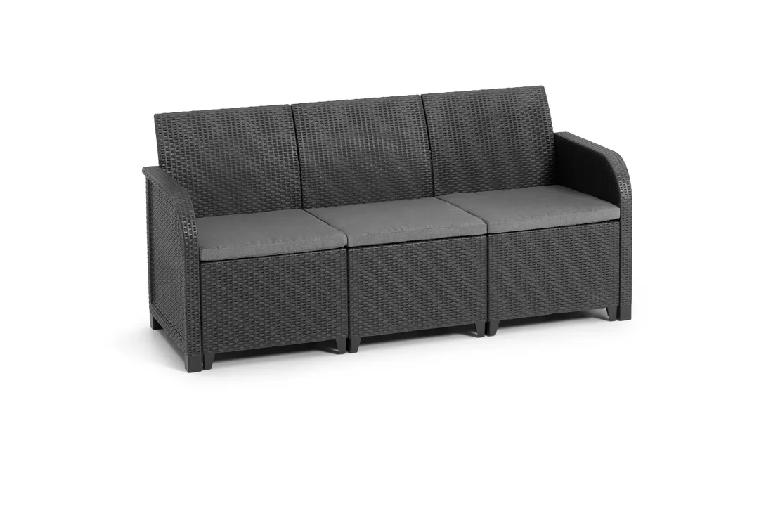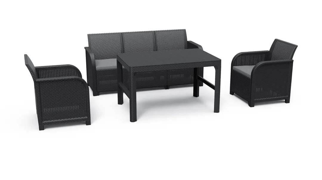Az új, kényelmes 5 személyes Rosalie kerti bútor szett lekerekített karfáival ideális kertekhez, erkélyekhez és teraszokhoz. A Rosalie rattan szett segítségével akár kis helyen is létrehozhatod álmaid pihenőhelyét a szabadban. Az egyedi szerkezet lehetővé teszi a választást két különböző kombináció között az összeszerelés elkezdése előtt, összeállítható egy két kanapés, egy székes és egy asztalos kombináció is. A bútorok könnyen tisztán tarthatók, az UV sugárzás és az időjárás káros hatásai elleni védelemmel rendelkeznek. A bútorok gyorsan és egyszerűen összeszerelhetők a “just click and go” kialakításnak köszönhetően. A termék további előnyeihez tartoznak a kényelmes, megfelelően kialakított ülések puha, polipamut párnákkal.