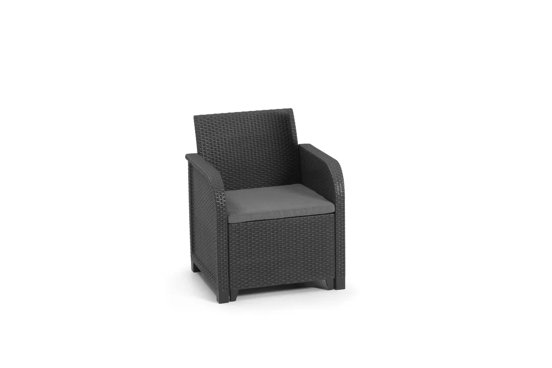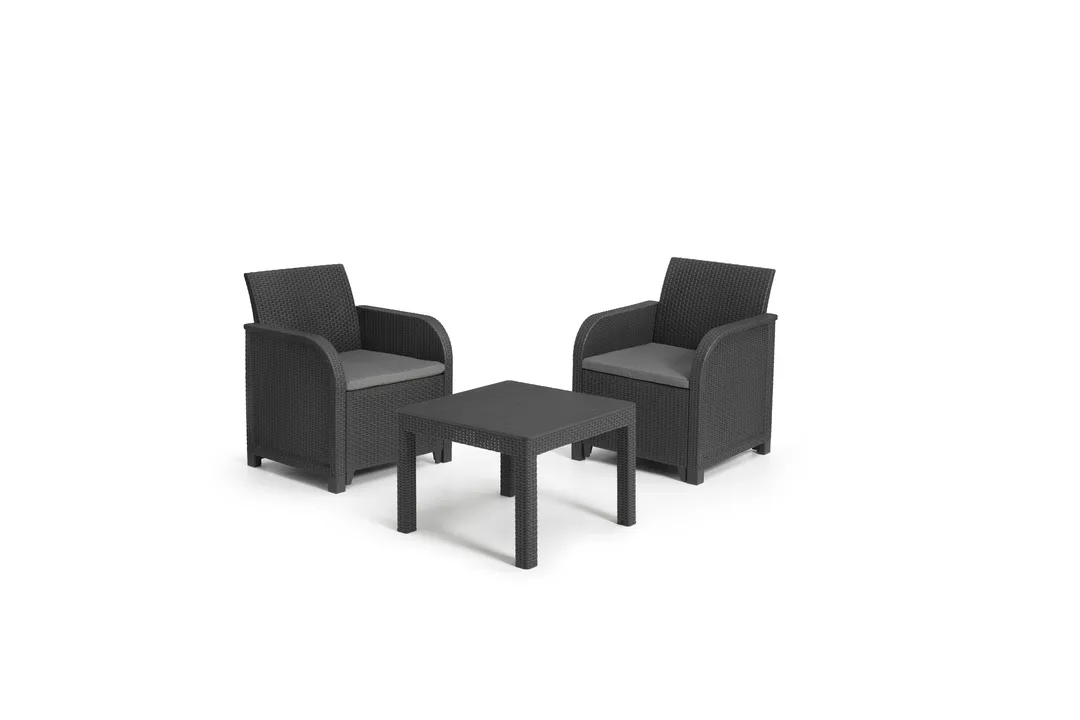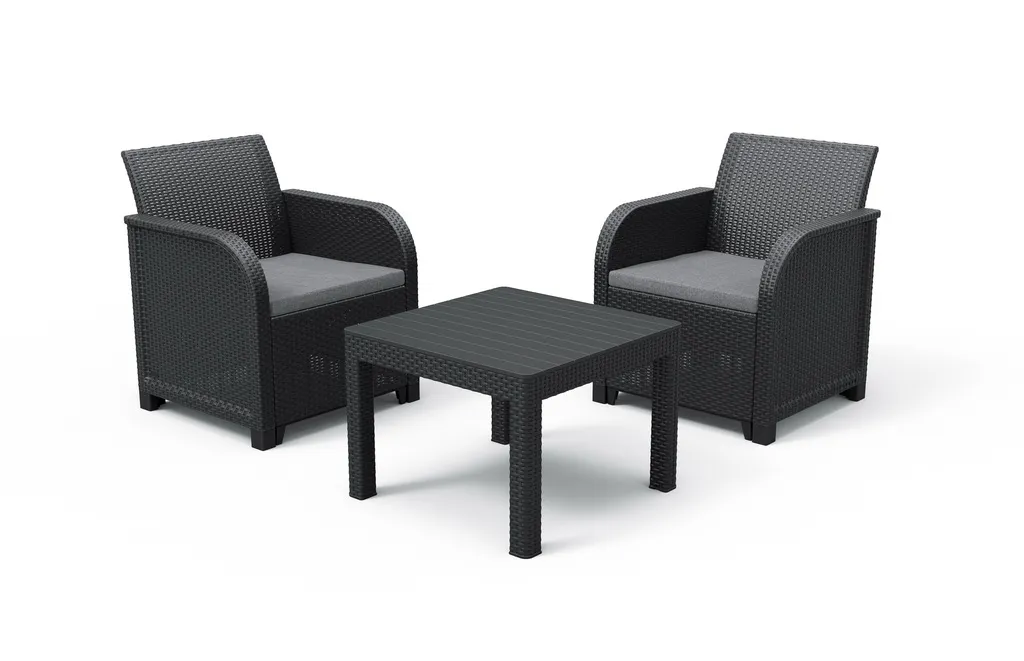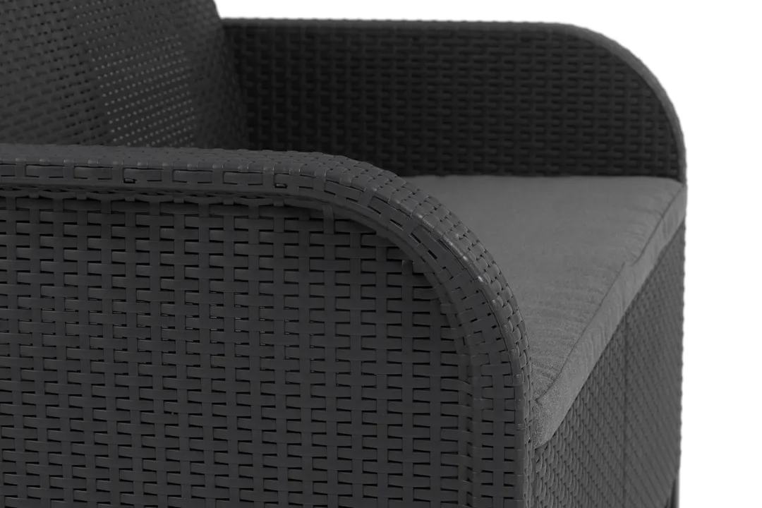Az új, lekerekített karfákkal rendelkező Rosalie erkély szett ideális választás kertekhez, erkélyekhez, teraszokhoz. A Rosalie rattan szett segítségével akár kis helyen is létrehozhatod álmaid pihenőhelyét a szabadban. A szett két fotelből és egy klasszikus asztalból áll. A termék előnyeihez tartoznak a kényelmesen kialakított ülések és puha polipamut párnák. A szett könnyen tisztán tartható, UV sugárzás elleni védelemmel ellátott. A bútorok gyorsan és egyszerűen összeszerelhetők a “just click and go” kialakításnak köszönhetően.